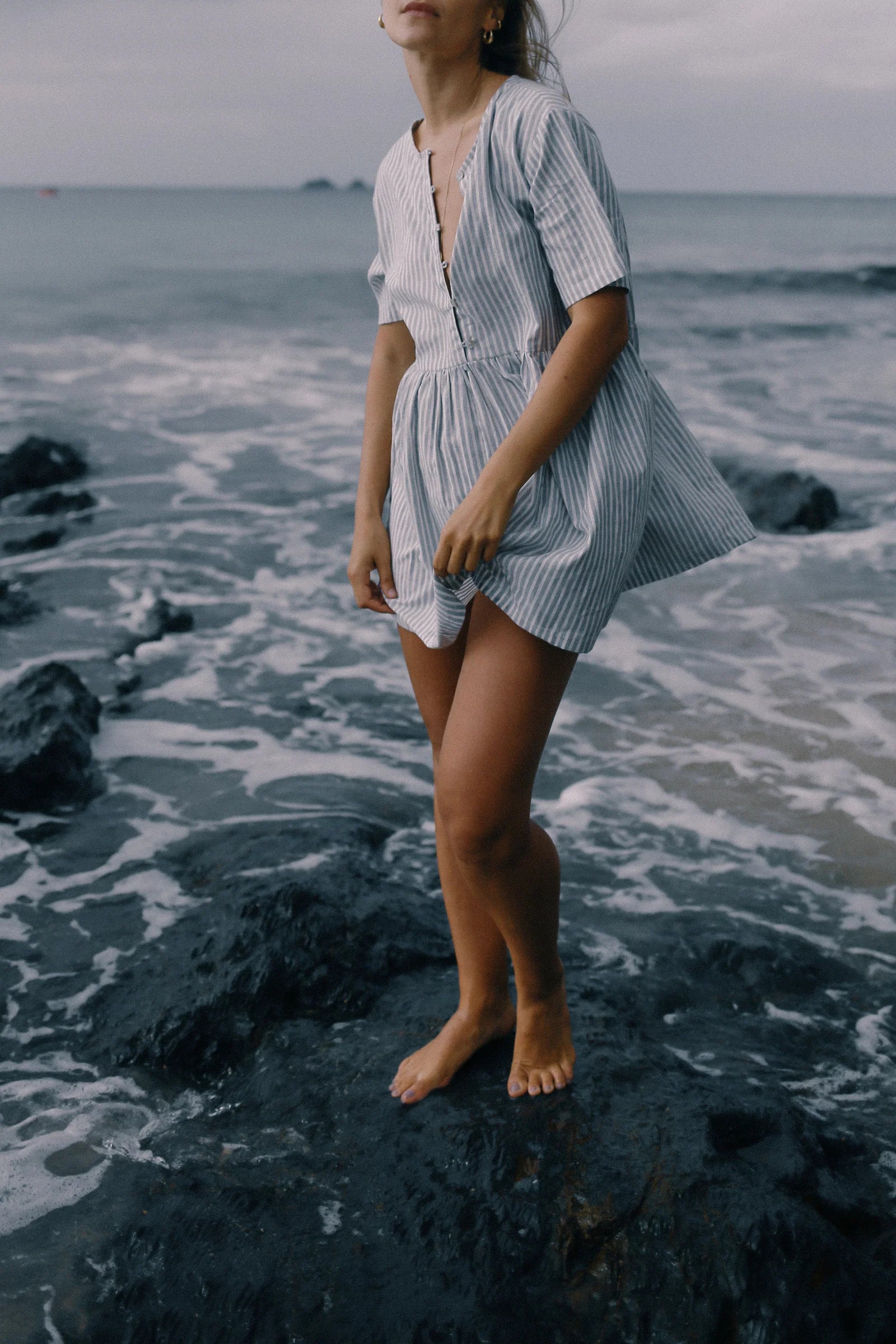 A cool and breezy piece is the perfect ‘chuck on’ to get you through those warmer days. Featuring an oversized fit, wide neckline, button-down neckline, babydoll skirt and a flattering wide sleeve. Made from an Organic Cotton and Hemp blend in a Washed Blue Stripe.