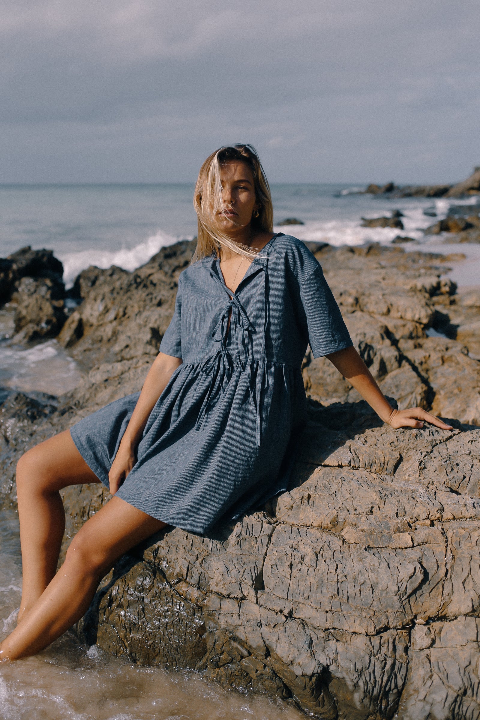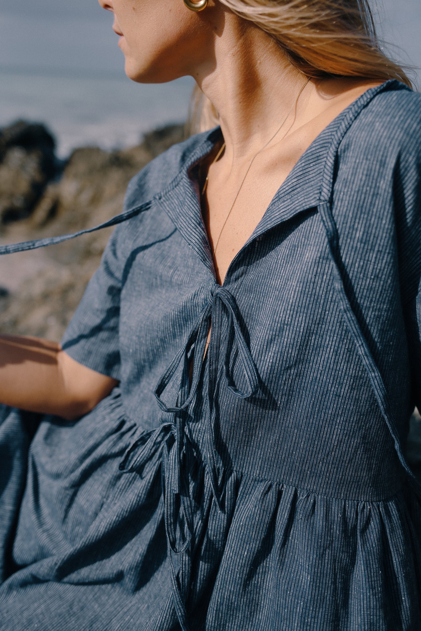 The Darcey Tie Dress features everything you love about the Classic Darcey Dress but with a NEW tie up front addition to open and relax the neckline. Featuring an oversized fit, wide neckline, tie-up front neckline, babydoll skirt and a flattering wide sleeve. Crafted from our new favourite Organic Cotton and Hemp blend in a classic Navy Pinstripe.